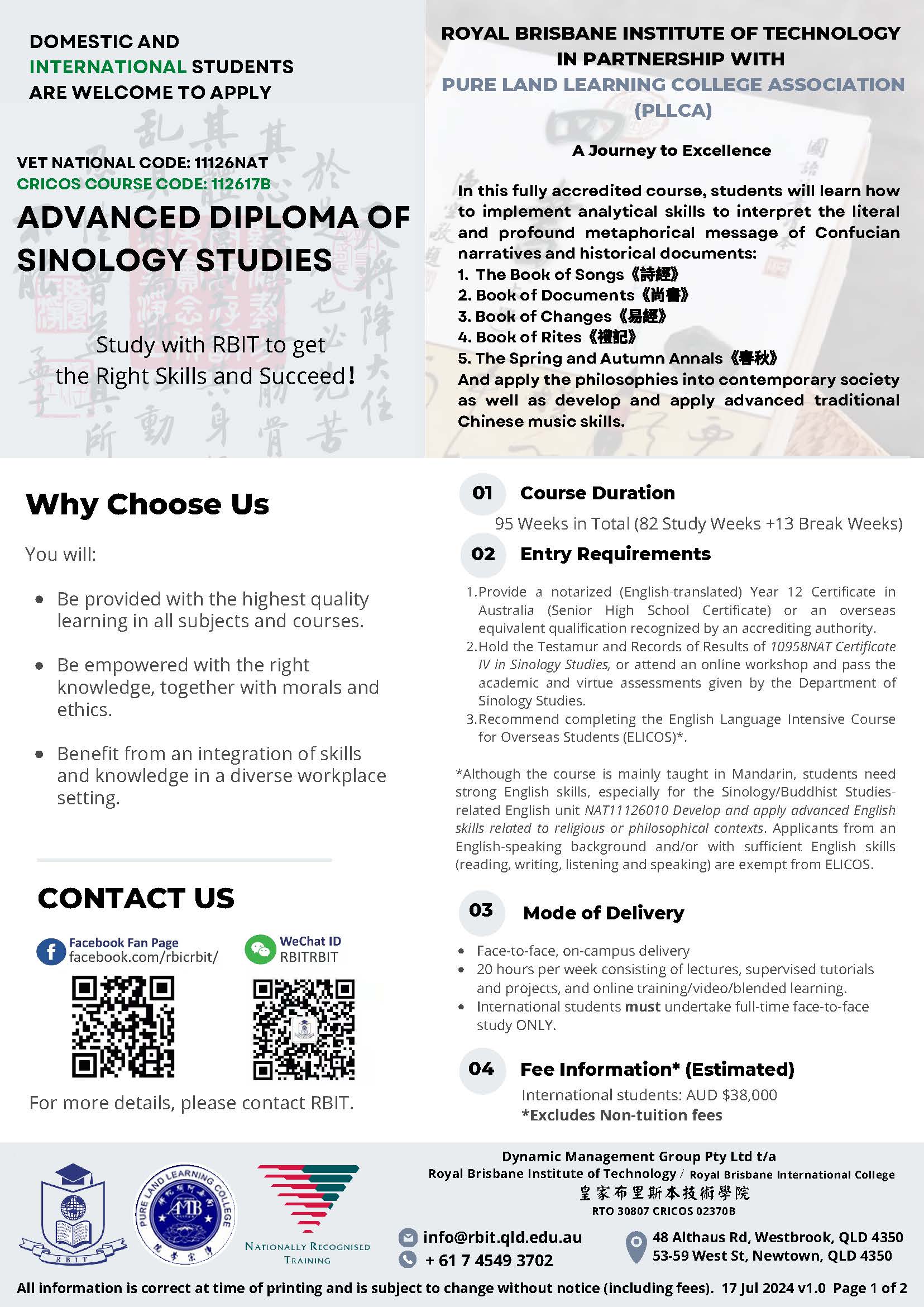 1. Provide a notarized (English-translated) Year 12 Certificate in Australia (Senior High School Certificate) or an overseas equivalent qualification recognized by an accrediting authority. 2. Hold the Testamur and Records of Results of 10958NAT Certificate IV in Sinology Studies, or attend an online workshop and pass the academic and virtue assessments given by the Department of Sinology Studies. 3. Recommend completing the English Language Intensive Course for Overseas Students (ELICOS)*. *Although the course is mainly taught in Mandarin, students need strong English skills, especially for the Sinology/Buddhist Studies-related English unit NAT11126010 Develop and apply advanced English skills related to religious or philosophical contexts. Applicants from an English-speaking background and/or with sufficient English skills (reading, writing, listening and speaking) are exempt from ELICOS. |