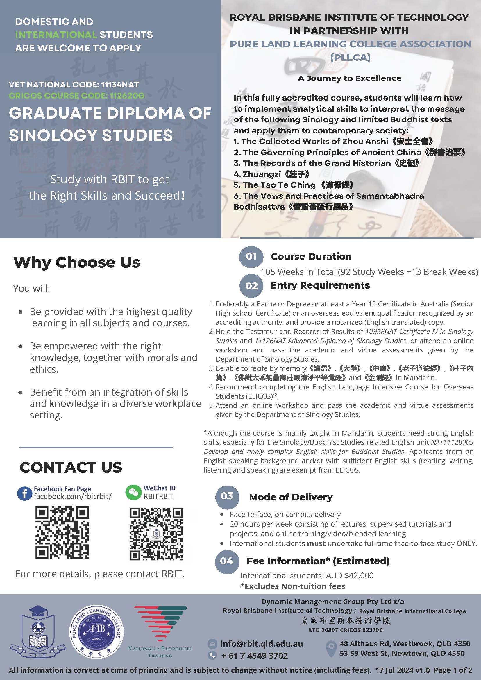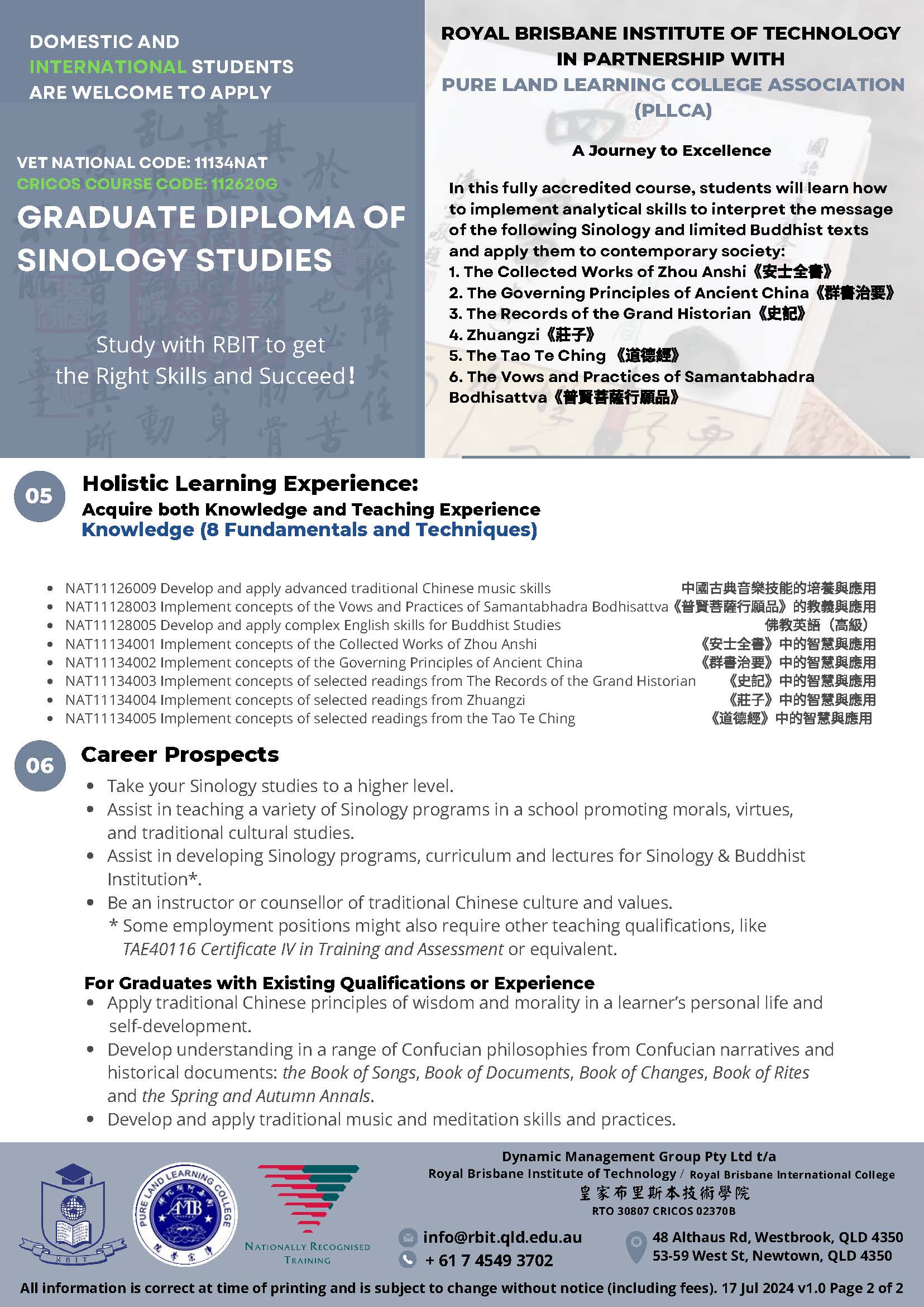 1. Preferably a Bachelor Degree or at least a Year 12 Certificate in Australia (Senior High School Certificate) or an overseas equivalent qualification recognized by an accrediting authority, and provide a notarized (English translated) copy. 2. Hold the Testamur and Records of Results of 10958NAT Certificate IV in Sinology Studies and 11126NAT Advanced Diploma of Sinology Studies, or attend an online workshop and pass the academic and virtue assessments given by the Department of Sinology Studies. 3. Be able to recite by memory《論語》,《大學》,《中庸》,《老子道德經》,《莊子內篇》,《佛說大乘無量壽莊嚴清淨平等覺經》and《金剛經》in Mandarin. 4. Recommend completing the English Language Intensive Course for Overseas Students (ELICOS)*. 5. Attend an online workshop and pass the academic and virtue assessments given by the Department of Sinology Studies. *Although the course is mainly taught in Mandarin, students need strong English skills, especially for the Sinology/Buddhist Studies-related English unit NAT11128005 Develop and apply complex English skills for Buddhist Studies. Applicants from an English-speaking background and/or with sufficient English skills (reading, writing, listening and speaking) are exempt from ELICOS. |
