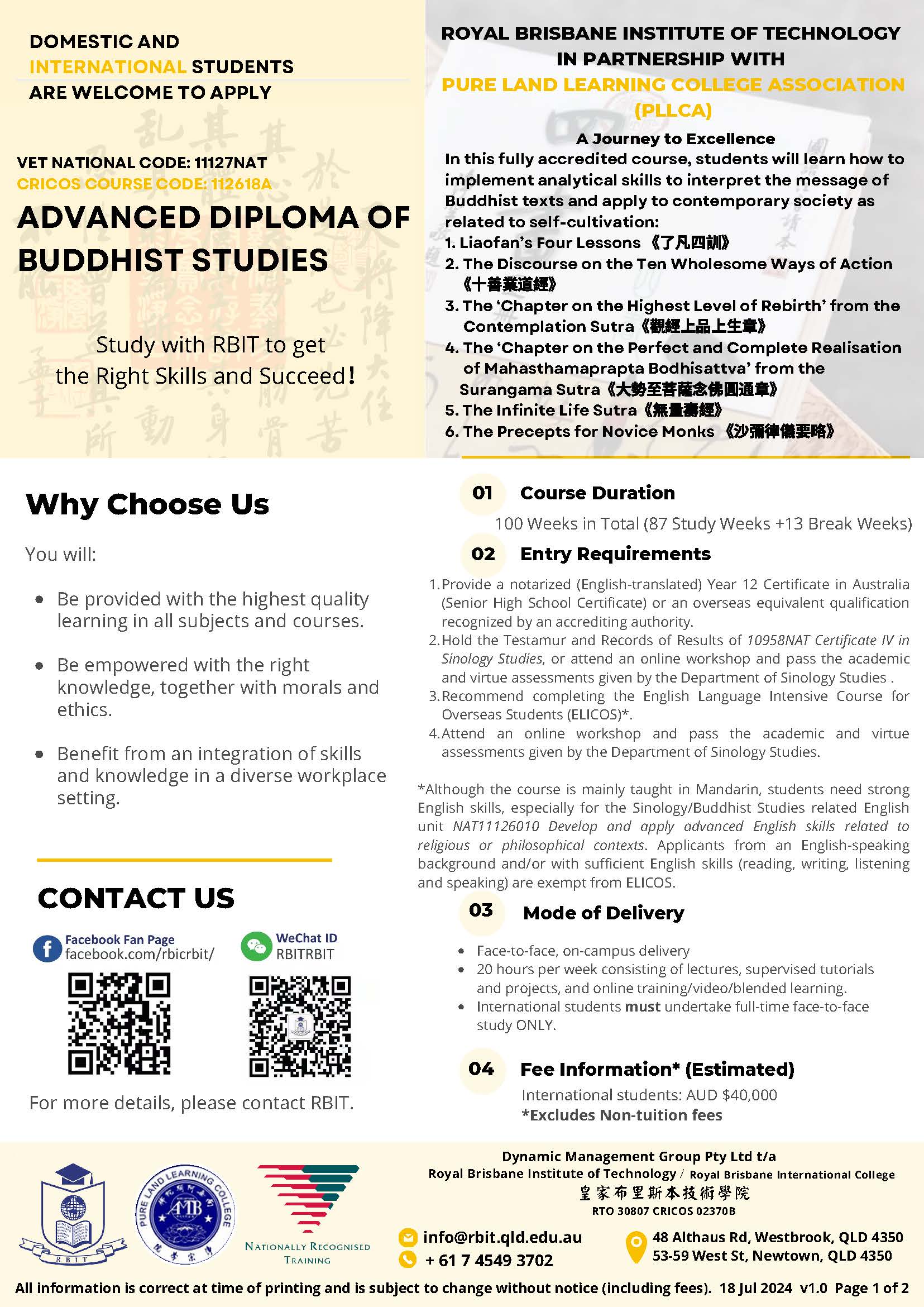 1. Provide a notarized (English-translated) Year 12 Certificate in Australia (Senior High School Certificate) or an overseas equivalent qualification recognized by an accrediting authority. 2. Hold the Testamur and Records of Results of 10958NAT Certificate IV in Sinology Studies, or attend an online workshop and pass the academic and virtue assessments given by the Department of Sinology Studies . 3. Recommend completing the English Language Intensive Course for Overseas Students (ELICOS)*. 4. Attend an online workshop and pass the academic and virtue assessments given by the Department of Sinology Studies. *Although the course is mainly taught in Mandarin, students need strong English skills, especially for the Sinology/Buddhist Studies related English unit NAT11126010 Develop and apply advanced English skills related to religious or philosophical contexts. Applicants from an English-speaking background and/or with sufficient English skills (reading, writing, listening and speaking) are exempt from ELICOS. |