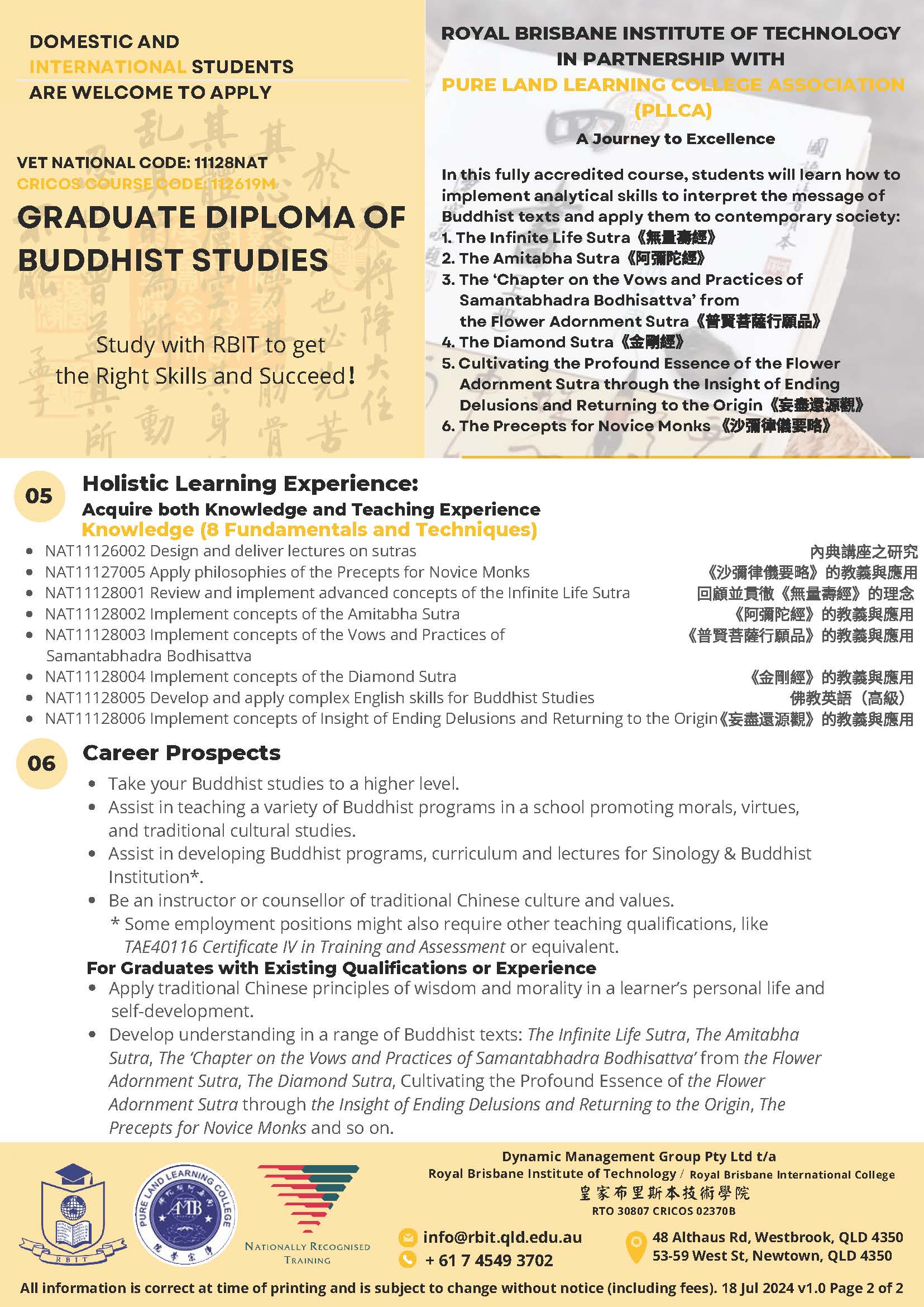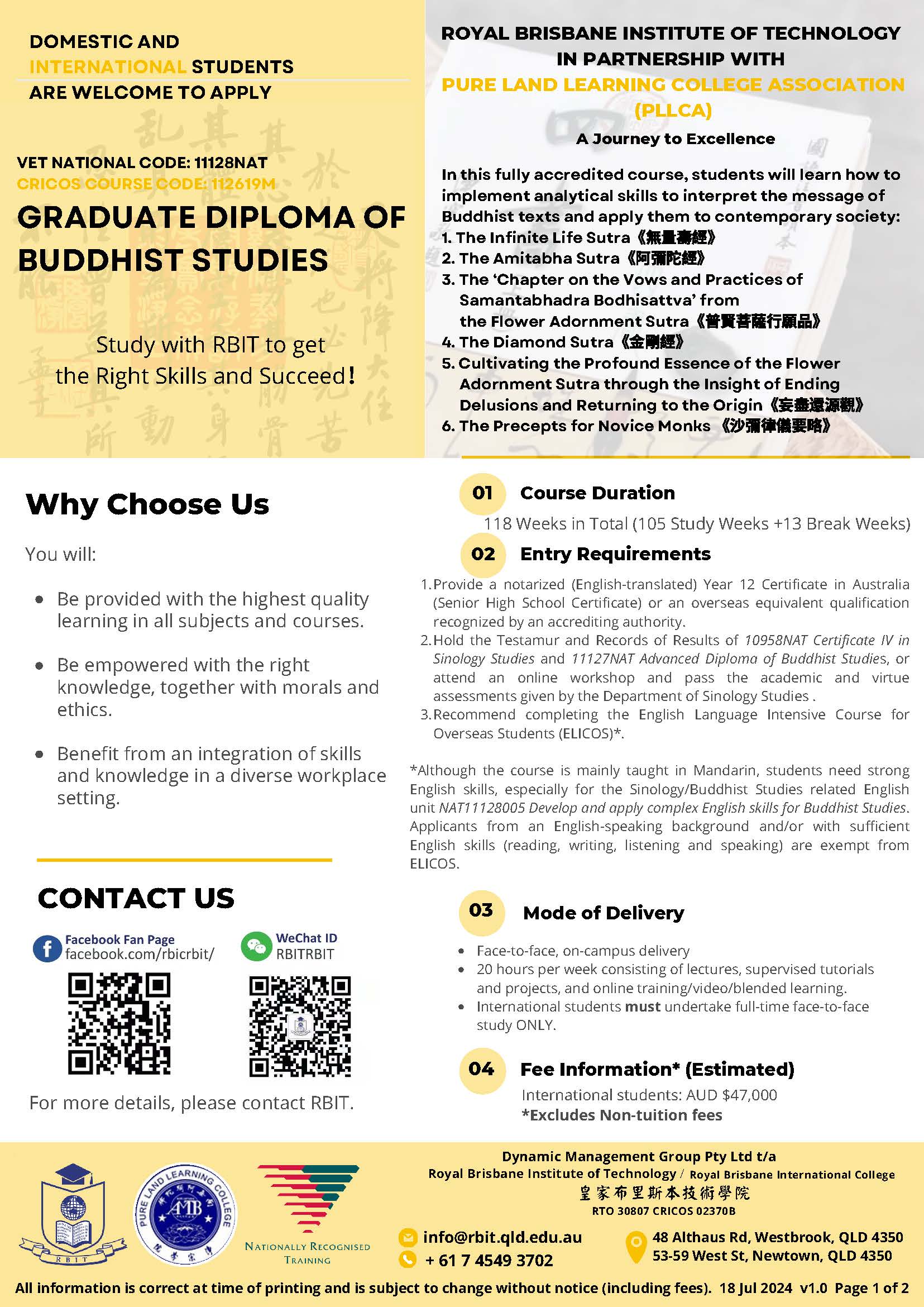 NAT11126002 Design and deliver lectures on sutras 內典講座之研究 NAT11127005 Apply philosophies of the Precepts for Novice Monks《沙彌律儀要略》的教義與應用 NAT11128001 Review and implement advanced concepts of the Infinite Life Sutra 回顧並貫徹《無量壽經》的理念 NAT11128002 Implement concepts of the Amitabha Sutra《阿彌陀經》的教義與應用 NAT11128003 Implement concepts of the Vows and Practices of Samantabhadra Bodhisattva《普賢菩薩行願品》的教義與應用 NAT11128004 Implement concepts of the Diamond Sutra《金剛經》的教義與應用 NAT11128005 Develop and apply complex English skills for Buddhist Studies 佛教英語(高級) NAT11128006 Implement concepts of Insight of Ending Delusions and Returning to the Origin《妄盡還源觀》的教義與應用 |