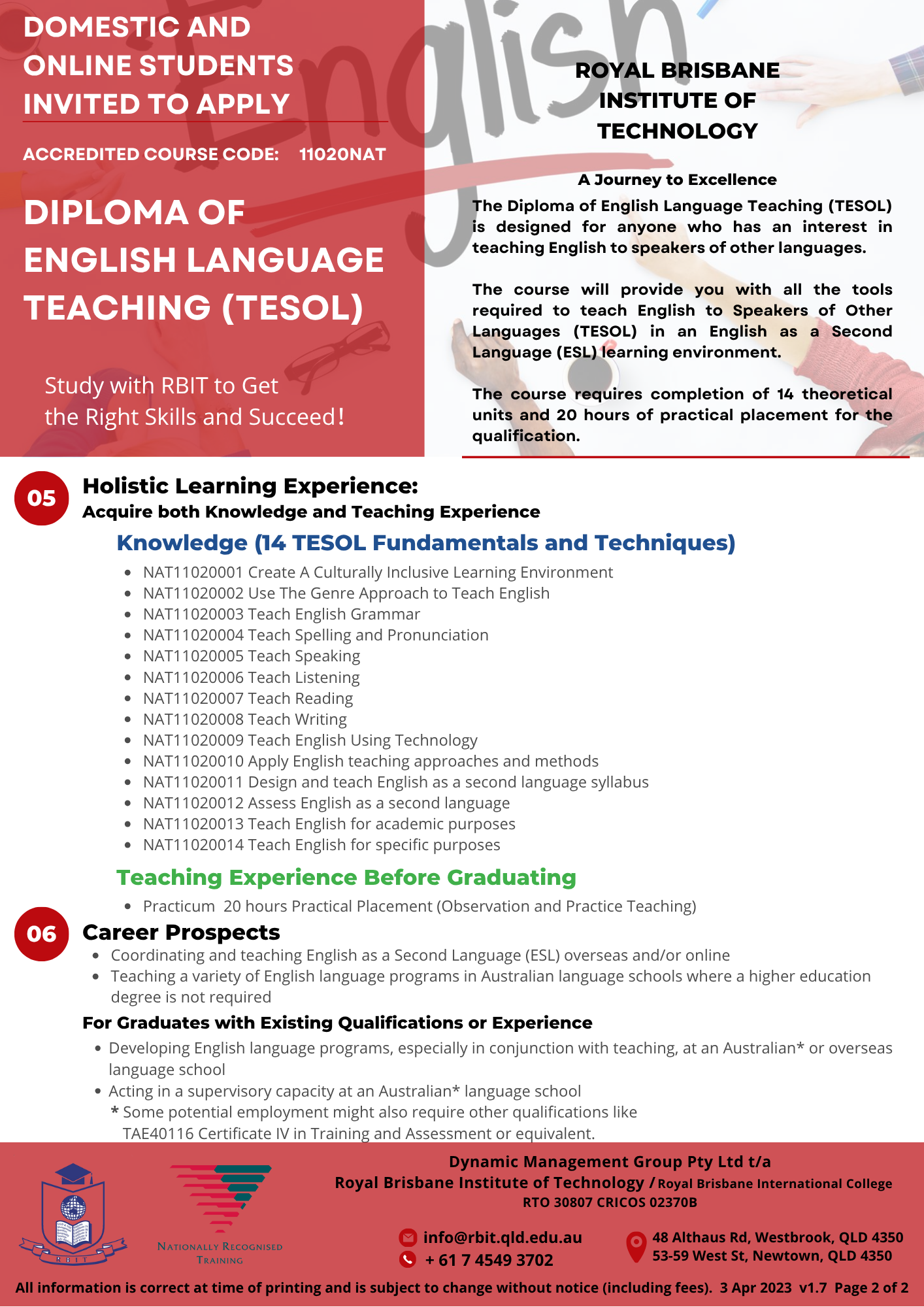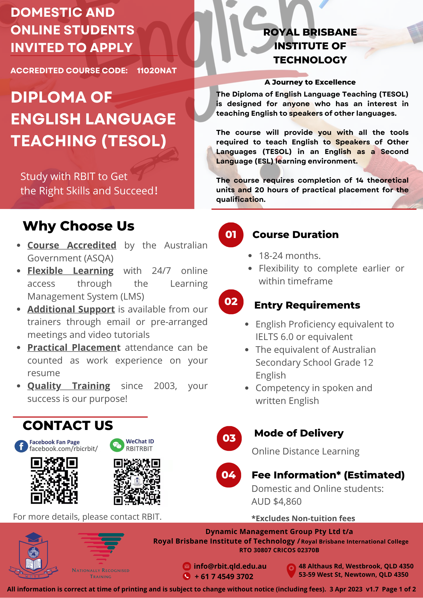 The Diploma of English Teaching (TESOL) is designed for anyone who has an interest in teaching English to speakers of other languages.